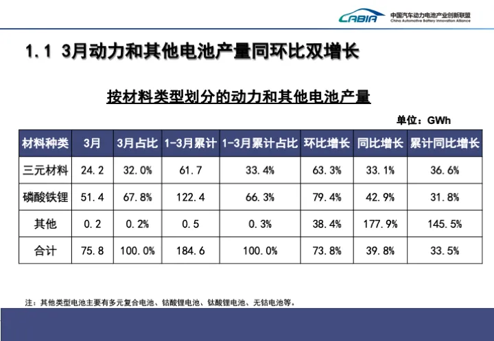 1-3月,我国动力和其他电池合计累计产量为184.6GWh,累计同比增长33.5%。