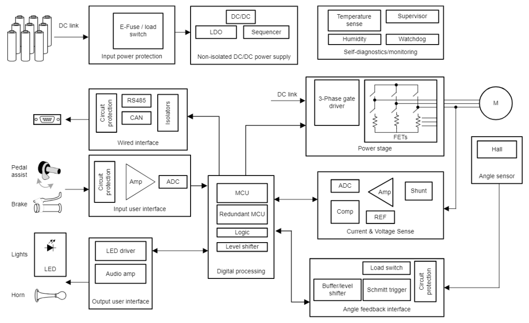 电动自行车是包含五个关键组件的自行车:电机、电池、控制装置、传感器和显示屏。电机是电动自行车不可或缺的一部分,可用于在脚踏期间提供所需的额外电力。如图 4 中的方框图所示,若要高效可靠地旋转电机(可安装在前部、中央或后部),需要角度传感器。