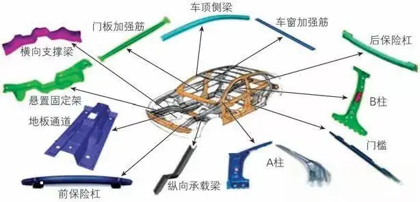 热成形技术通过热处理和高温成形相结合的方式来实现零件的高强度。热成形技术适用于对舒适性、强度和安全性要求高的零件,典型的热冲压零件有前、后门左右防撞杆(梁),前后保险杠横梁,A柱、B柱、C柱加强板,地板中通道和车顶加强梁等,如图4所示。