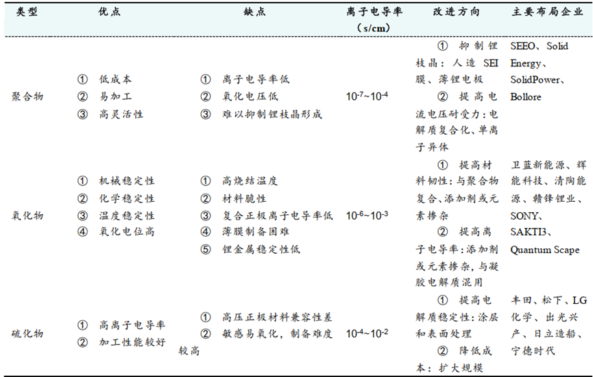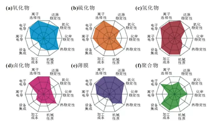 固态电解质是固态电池成功应用的关键:理想的固态电解质应该具有小到可以忽略不计的电子电导率、优良的Li+电导率、良好的化学兼容性、宽的电化学稳定窗口、优异的热稳定性以及能够低成本的大规模生产等特点。通常来说,具有代表性的固态电解质包括硫化物固态电解质、氧化物固态电解质、金属卤化物固态电解质和聚合物固态电解质。