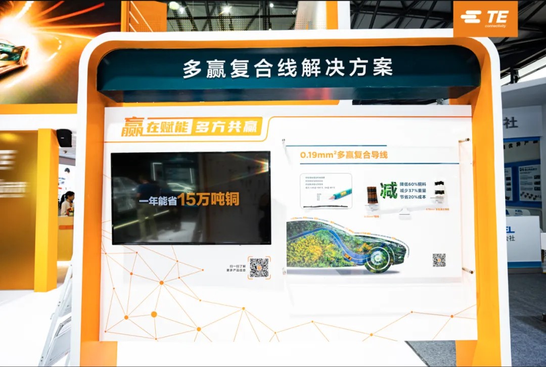 TE此次展出的多赢复合线解决方案,在不影响整车布局、不显著改变装配工艺、不改变端子压接工艺和设备、不影响线束可靠性、不增加电化学腐蚀风险的前提下,成功实现让汽车线束线径减少至0.19mm2,预计可成功实现整车低压线束减铜约60%,减重37%,并促成单车年度减少碳排放约20kg(按生产端与年行驶约1万公里估算),使得线束系统的总成本显著降低。TE正积极携手产业链生态圈伙伴,助力中国汽车产业革新线缆结构,减铜降重,节碳省本,推动社会可持续发展,实现多方共赢。