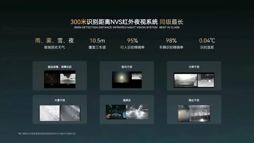 尤其值得一提的是,L380搭载由轩辕智驾开发的堪比侦察无人机的“NVS超视距智能红外夜视系统”,可扫除风雪雨雾等恶劣天气影响,300m的成像距离保证用户“看的”更清晰,基于红外感知技术的优势,能轻松应对雨雾雪沙尘等复杂气候及强眩光等光线干扰,为每一次安全驾驶保驾护航。