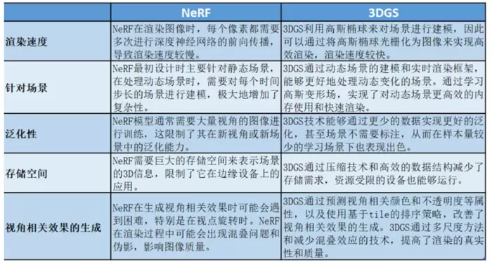与神经辐射场(NeRF)等用位置和视点条件神经网络表示3D场景的神经隐式表示不同,3D GS利用一组高斯椭球来对场景进行建模,因此可以通过将高斯椭球光栅化为图像来实现高效渲染。3DGS在渲染速度、图像质量、定位精度等方面呈现出了非常优异的表现,全面补足了NeRF的短板。同时,基于3DGS的重建场景能够1:1复刻在真实智驾上发现的边缘场景(Corner Case),通过动态场景泛化,提升端到端智驾系统应对Corner Case的能力。下图NeRF和3DGS的对比。