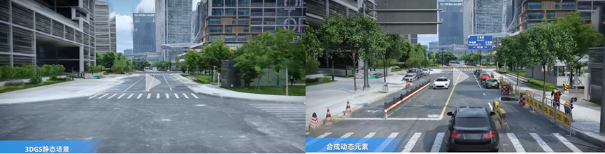 (2)在通过3DGS点云建模的基础上,通过优化的AI融合算法,将静态3DGS场景与此前积累的静态场景库、动态的交通场景库和各类传感器仿真进行了自然融合。确保了整体场景的连贯性和视觉真实感,并实现了场景丰富度指数级增加。同时,利用先进的全局渲染技术,生成高质量视图,确保多相机视角的一致性和高保真度,实现了逼真的渲染效果。