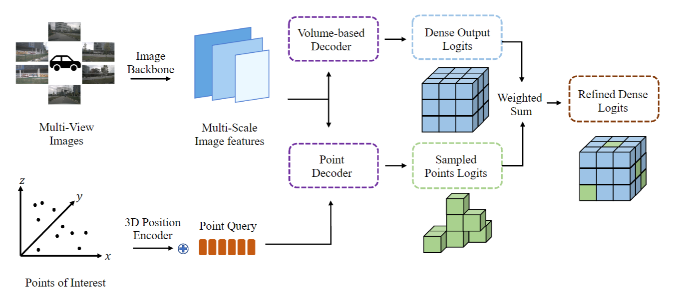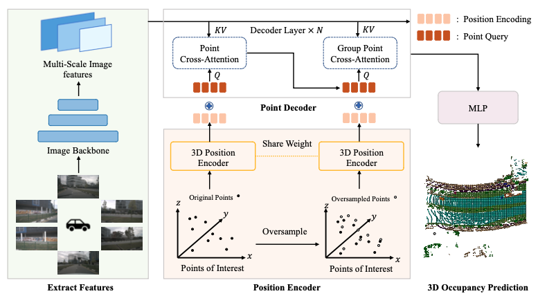 本文首先定义了 PoIs(Points of Interest)这一概念,这是一组用于表征三维场景的稀疏点,也是本文方法的核心。PoIs 可以表征空间中任意位置,包括普通的占据网格位置,或是需要受到额外关注的物体和区域。在模型的每一次前向推理中,当前 PoIs 的位置信息都会被编码并送入解码器。模型整体结构是基于变形器的编码器-解码器架构,包含骨干网络,位置编码器,点解码器和三维占据网格预测头。骨干网络负责从环视图像中提取多尺度图像特征;位置编码器负责对 PoIs 进行位置信息编码,并将其输入点解码器;点解码器负责将多尺度图像特征和位置编码信息进行交互和解码,进行注意力的计算,并将结果送入三维占据网格预测头;三维占据网格预测头负责预测 PoIs 对应的占据状态和语义信息。