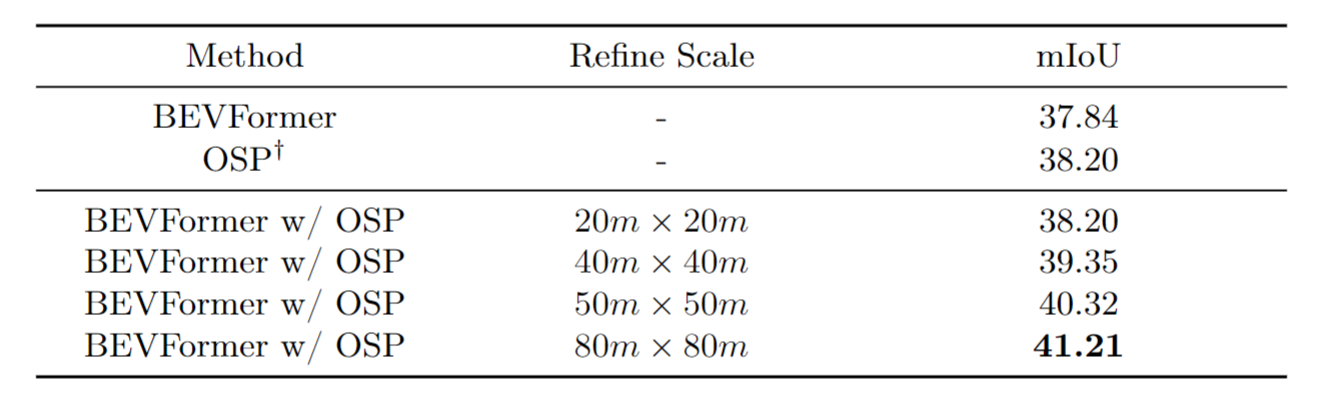 本方法可用于增强 BEV 表征的方法,其增强流程如下图所示。对于一个现有的 BEV 表征方法,OSP 冻结其特征提取的骨干网络并训练 OSP 的解码器部分,这保证了同一个冻结的骨干网络能同时用于 BEV 表征方法和本方法,对于同一样本可以提取出相同的图像特征。训练完成后,对于给定的环视图像输入,二维的图像特征被冻结的骨干网络提取,并同时使用 BEV 表征的解码器和本章的点解码器进行解码,对于 BEV 表征的稠密的预测结果,本方法可以自适应的选取置信度较低的位置作为 PoIs 并生成稀疏的点预测结果,通过将稠密输出和稀疏的点预测输出加权求和得到增强后的结果。