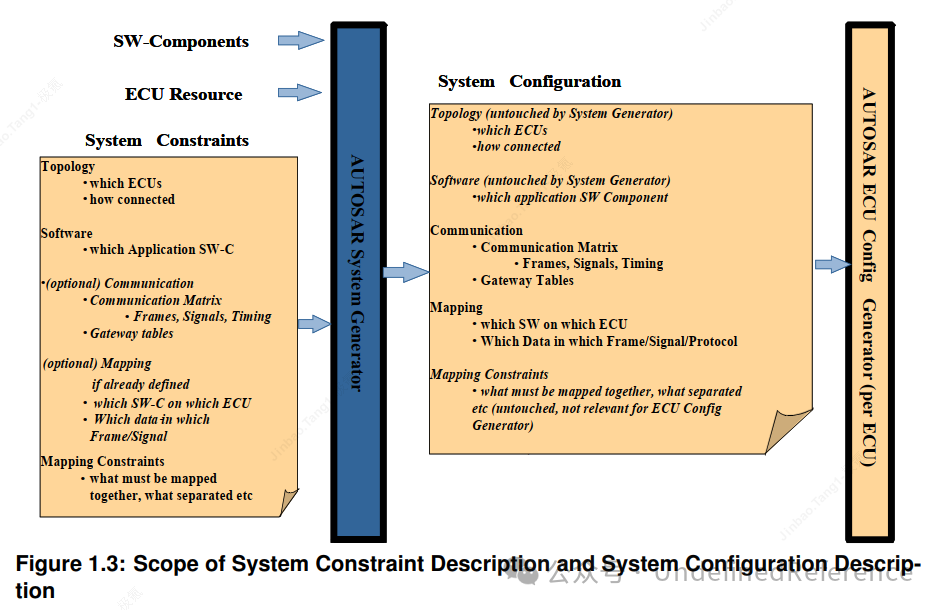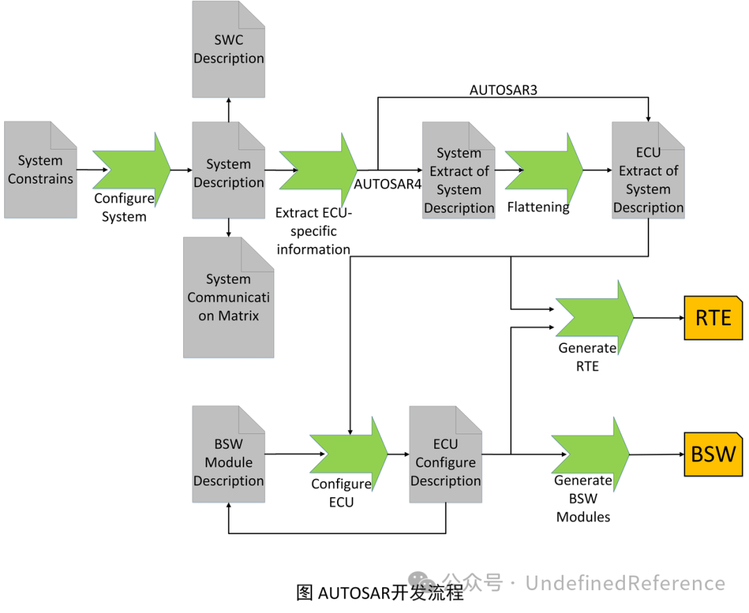 AUTOSAR设计和开发流程分为三个阶段:系统配置、ECU设计与配置阶段、代码生成阶段。官方下图: