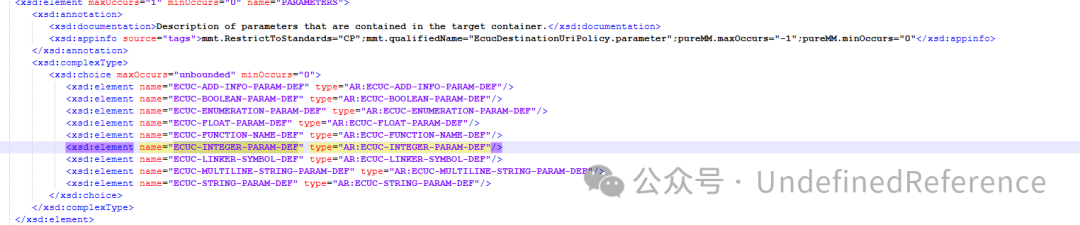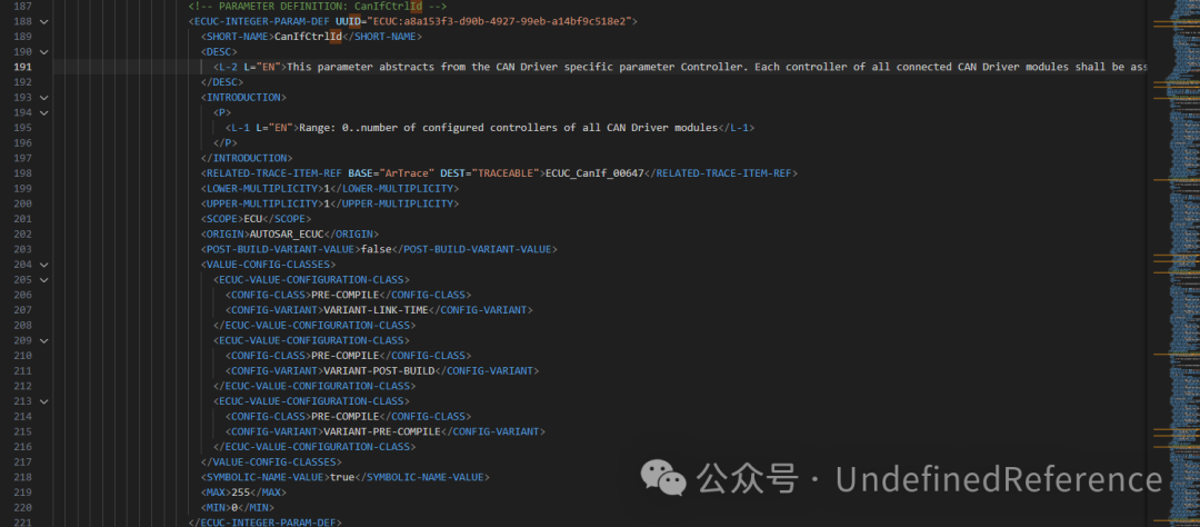很多人都使用过了不同的AUTOSAR CP ecu开发工具,都会发现不同的工具UI/UE千差万别,但是内容却高度一致,是因为这里面还有一个基于AUTOSAR scheme具化出来的规范文件,那就是bsw describtion definition文件,其不仅定义了不同组件的配置,不同组件间的依赖关系,还定义了相关配置的属性和约束。正是因为如此,在你使用davinci等工具时,会发现有些输入只能是字符串、数字或者只能下来选择,甚至还有范围约束。对于一个资深或者说优秀的cp ecu开发者来说,不管是谁家的平台,在掌握了其背后的原理后,使用工具就不是问题了。ps:针对不同的厂家,其bswdef.arxml是会有定制化更改的,但是这些都是明文的,都是直接打开阅读的。如下所示: