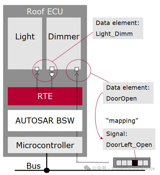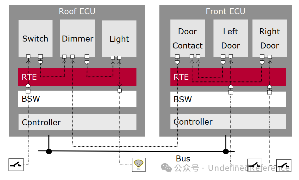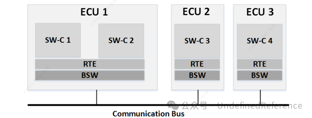 在顶层设计中,是将所有的ecu(整车)当做一个整体来看的,实际上不同的swc会根据功能、资源需求等因素分配在不同的ECU中,这个时候就要区分SWC的输入是来自同一ECU的全局变量,还是来自通信总线的数据,因此结合整车EE就会有如下图示。这个时候就进入了ECU开发阶段了。