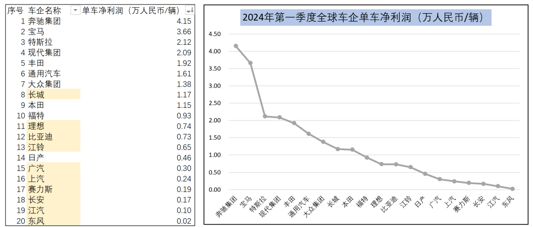2024年1季度,中国最赚钱的汽车品牌——比亚迪,其净利润为45.69亿元,刚好排在全球车企的前10。