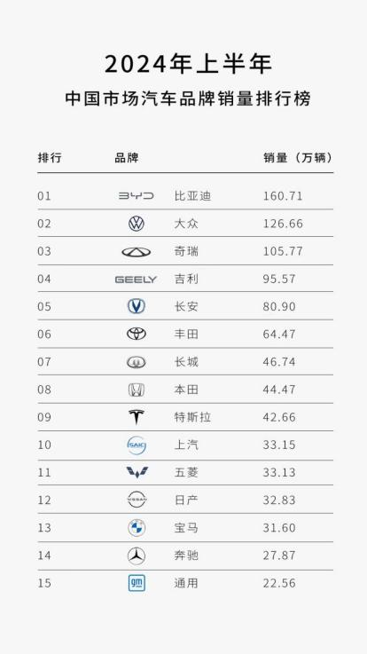 2024年上半年,本土汽车品牌的在国内的市场占有率进一步攀升,在排名前10的销量榜单中,6位是中国本土品牌,其中,比亚迪、奇瑞、吉利、长安均名列前五。