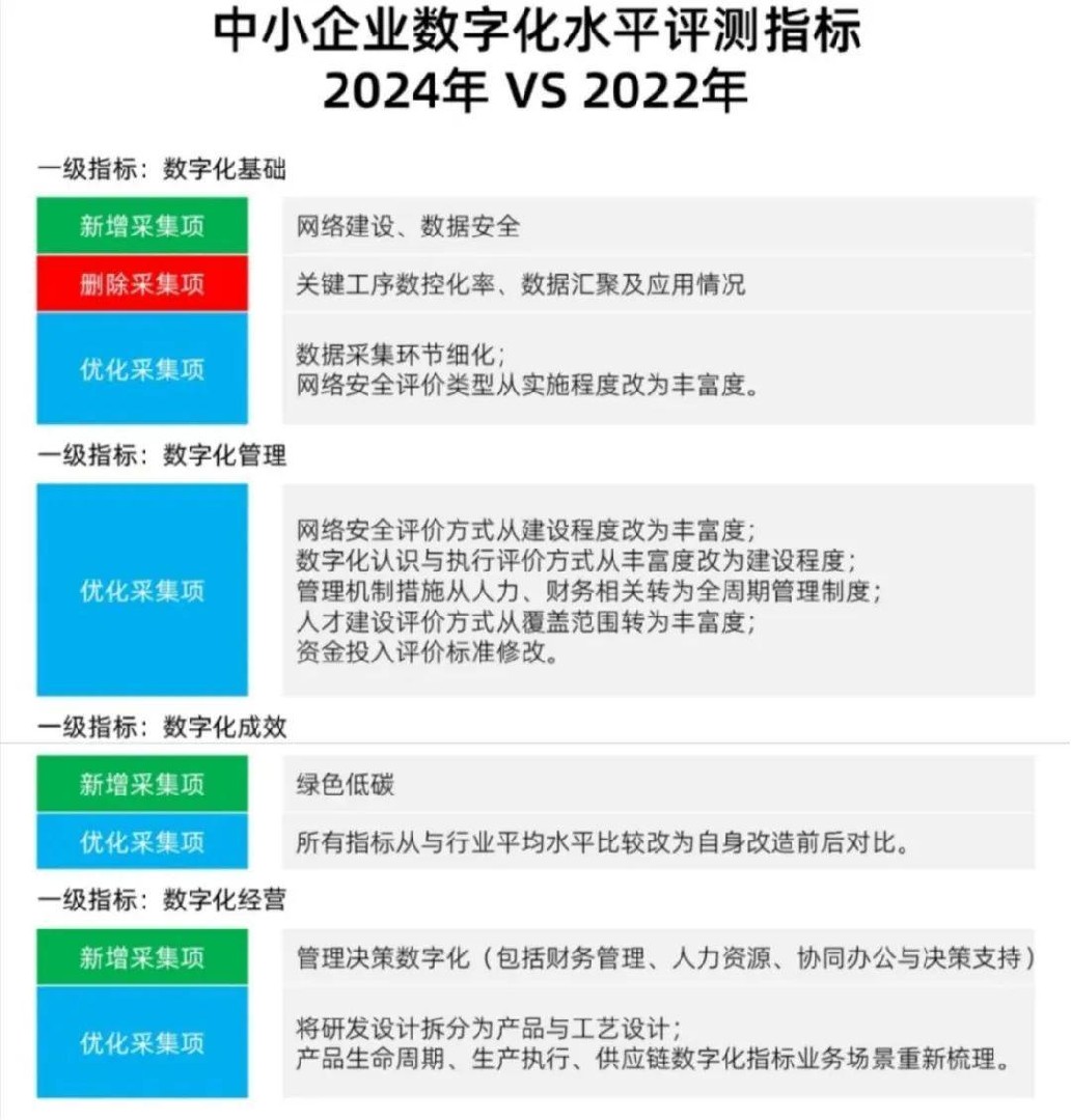 《评测指标(2024年版)》延续2022年版整体架构,从数字化基础、经营、管理、成效四个维度综合评估中小企业数字化发展水平,并对评测方式进行了调整优化。