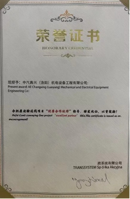 近日,中汽工程下属中汽昌兴承接的合肥康迪线安装项目得到客户的高度认可,被客户授予“优秀合作伙伴”和“优秀供应商”荣誉称号。该项目为承接波兰TRANSSYSTEM公司在大陆马牌轮胎(中国)有限公司四期项目-硫化及终检区域的输送线建设工作,项目团队严格把控设备安装质量,最终实现了首胎下线零卡顿,如期优质的完成了项目的安装工作。