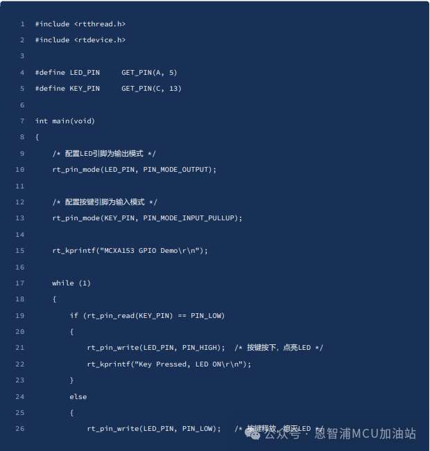 这个例子展示了如何使用RT-Thread的GPIO API来控制LED和读取按键状态。通过简单的几行代码,我们就能实现基本的GPIO操作。