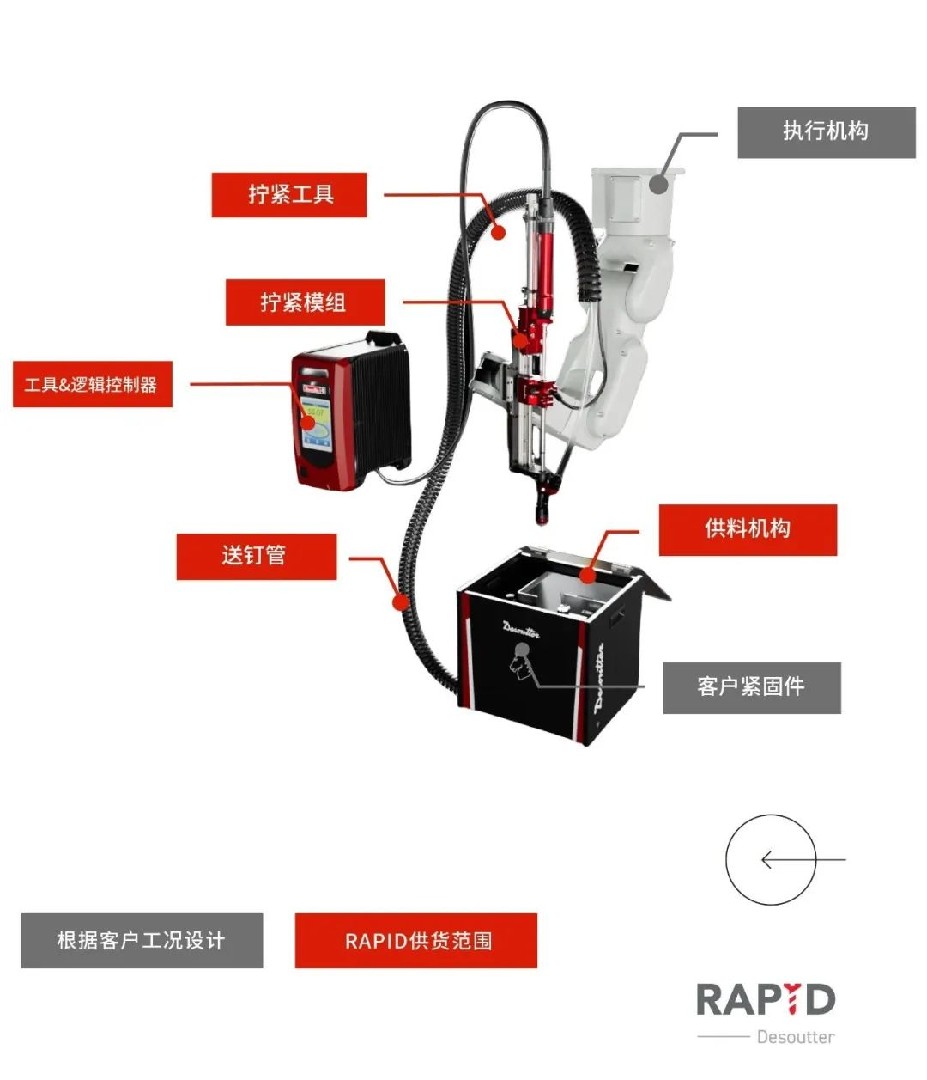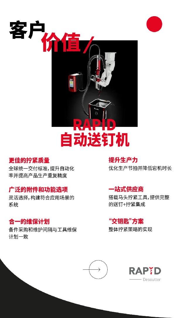 马头动力推出,本地化研发、生产的送钉系统:RAPID。搭载马头动力久负盛名的拧紧工具,向客户提供一站式、成套的拧紧解决方案。向客户提供简化的项目采购流程、与工具合一的维保计划以及全球统一的交付标准。