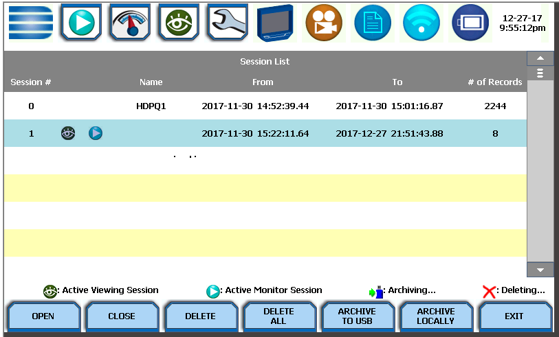 要在本地存档,请从列表中选择 amonitoring session。请注意,无法选择主动监控会话 – 主动会话当前正在使用中,并且在列表中旁边有 Play (播放) 图标。如果要在不关闭监控的情况下从活动会话下载数据,则必须使用 DV7。