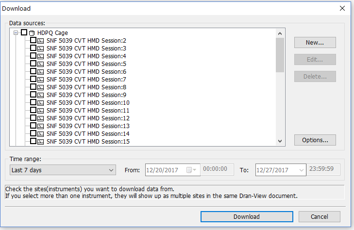 要创建新数据源,请单击 New 按钮,输入数据源的名称 (任何名称都可以),然后输入远程检测的 IP 地址。大多数用户不会更改其仪器的密码。如果是这样,您可以使用默认设置;否则,请输入检测的密码。完成后,单击 OK(确定),然后从列表中选择要下载的数据源和监控会话。下拉列表 时间范围 列表以选择要下载的时间范围,然后单击 下载 按钮。完成后,DV7 将下载并显示数据。