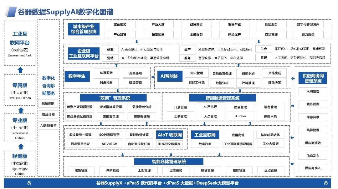 在助力中小制造企业数字化转型方面,谷器数据发挥着重要作用。谷器数据在数字化服务领域拥有二十余年的深耕经验,积累了深厚的行业经验与技术底蕴。面对AI技术带来的变革,谷器数据前瞻性地布局AI前置发展战略,深度融合AI技术与自身产品服务体系。其接入DeepSeek等大模型,打造出基于谷器SupplyX+aPaaS低代码平台+dPaaS大数据+DeepSeek大模型平台构建的谷器数据SupplyAI智能体,能够为企业客户提供更普惠、智能、高效、个性化的数字化解决方案。在AI+低代码平台领域,接入DeepSeek大模型后,平台智能化程度大幅提升,业务人员通过简单拖拽操作,借助智能辅助实现代码自动生成与优化,极大缩短应用开发周期、降低成本。AI+BI解决方案利用大模型强大数据分析能力,深度挖掘企业海量数据,为企业提供精准决策支持。如在生产管理层面,借助SupplyAI智能体,可实现生产数据实时采集与分析,为生产决策提供精准依据,有效解决生产工艺复杂带来的质量控制难度大、生产效率低以及数据采集和分析不足等问题,提升生产效率和质量控制水平。